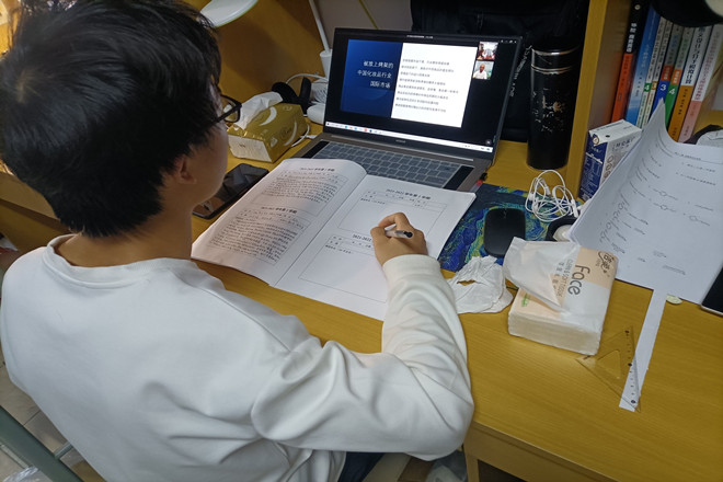 学生在宿舍认真听讲
