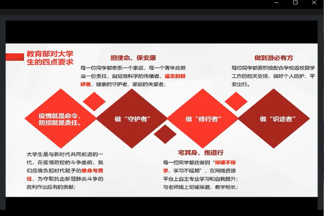 这次讲课主要分为三部分,国内外疫情回顾、疫情中的大学生、疫情中的学生干部。课程开始,高静老师向我们展示了国内外疫情发展情况。疫情期间,国难当头,无数英雄人物涌现,扛起了抗疫的大旗。在这次疫情抗击站中,无数中国企业从零开始转型口罩制作;无数白衣天使燃烧年华与死神抢人;无数司机自愿上路为武汉运输物资;无数中国奇迹被创造——五天建成可以容纳3500名轻症患者的方舱医院、十天建成火神山医院、一个月集结2.5万名医护精英开进湖北。那些逆行者,都是担天下之重责的勇敢者。同时在国外疫情严重期间,中国也派出医疗队并携带各种医疗物资援助韩国、日本、意大利等国,充分展示了大国形象和大国风范。