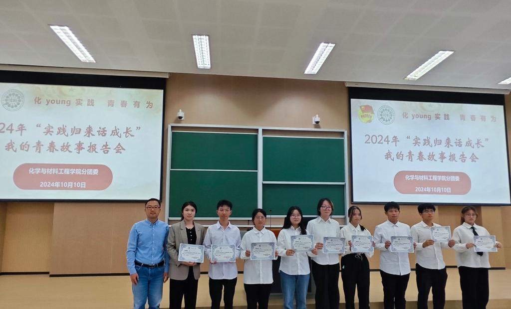 分享汇报环节,各实践团队代表结合项目主题,分别从实践内容、实践过程、实践宣传、实践感悟等方面,分享实践过程中的青春故事,彰显化院学子的责任与担当。秉持着“奉献、友爱、互助、进步”的团队理念,“绿晖悦老”实践团深入基层社区,真真切切为居民办实事;科技就是第一生产力,“美丽化学”实践团走进美妆企业,探访新质生产,坚定投身本专业发展的信心和决心;“纳材聚能”实践团着眼乡村振兴,体验智慧农业,完善校地合作,开辟了别具一格的社会实践赛道;雨花台、中山陵、总统府,“七五铸梦”实践团探寻金陵,沿着历史的长廊,寻找被岁月镌刻的印记;“酸碱共轭”实践团以公益助学的方式,将化学的魅力和神奇带给偏远地区的祖国花朵,促进教育公平;“碳为惠止”实践团聚焦碳普惠,线上线下双管齐下,为推进建设美丽新中国贡献青春力量;“豫行长征”实践团重走长征路,传承红色魂,身体和精神都在路上,在革命先烈救亡图存的路上,也在青春为祖国挺膺担当的路上;寻找老兵、聆听历史、留存资料、延续传统,“鼋访风华”实践团致力于挖掘和传播退伍军人的访谈故事,进行与革命历史的零距离触摸,与家国情怀的全方位环绕;参访企业、科普教育、DIY防晒霜,“春风化雨”实践团像“随风潜入夜”的春雨般滋润着公众的科学素养。汇报结束后,鞠峰为9支优秀实践团队颁奖并合影留念。