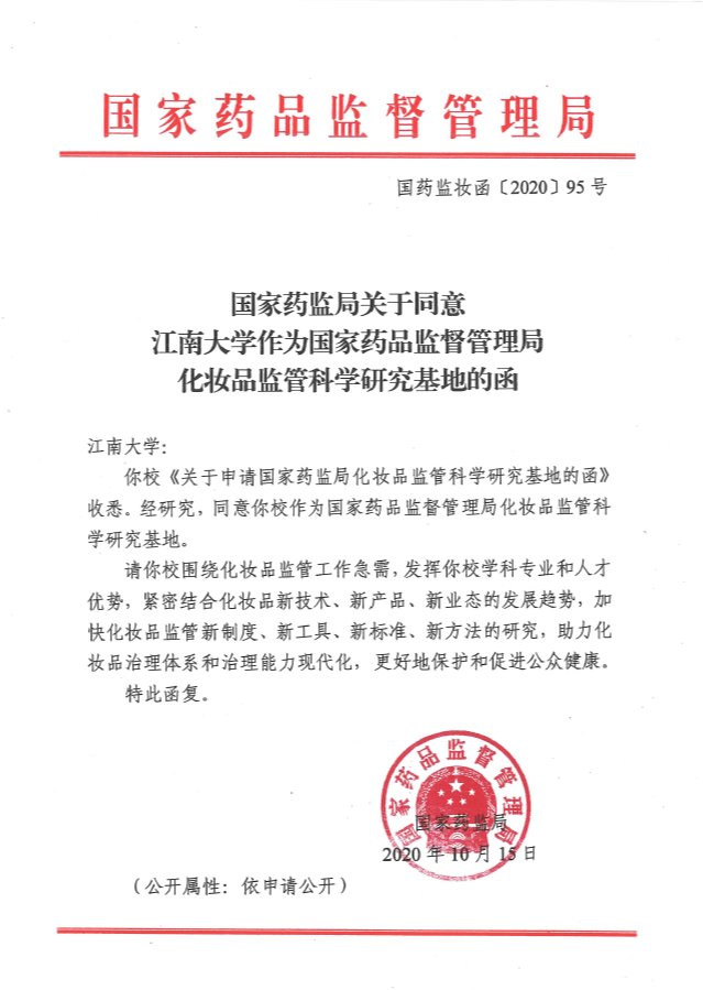 近日,学校收到《国家药监局关于同意江南大学作为国家药品监督管理局化妆品监管科学研究基地的函》,国家药监局正式批准江南大学成为国家药品监督管理局化妆品监管科学研究基地。