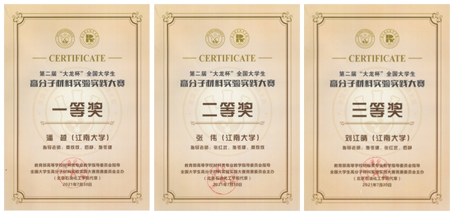 暑假期间,第二届“大龙杯”全国大学生高分子材料实验实践大赛在北京石油大学拉开帷幕。经过激烈角逐,由我院罗静、施冬健、桑欣欣和张红武四位老师指导的高分子材料专业三名参赛选手全部获奖——潘越、张伟和刘江晴分别荣获一等奖(最高奖)、二等奖和三等奖的好成绩。