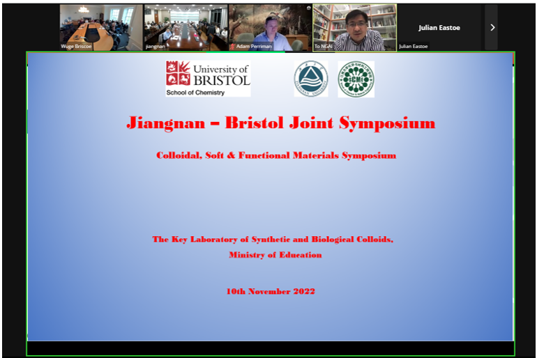11月10日,化工学院举办首届江南大学-布里斯托大学“胶体、软物质与功能材料”联合研讨会(Jiangnan – Bristol Joint Symposium on Colloidal, Soft & Functional Materials )。参加本次研讨会的双方师生共计约200人。betway中国西汉姆联官网副院长马丕明教授,崔正刚教授,刘雪锋教授,蒋建中教授以及合成与生物胶体重点实验室的部分骨干教师线下参加了本次研讨会。布里斯托大学化学学院院长Emma Raven教授、科学学部国际交流主任Charl F. J. Faul教授、化学学院国际交流主任Wuge H Briscoe 教授等专家学者在英国集体线下参会。