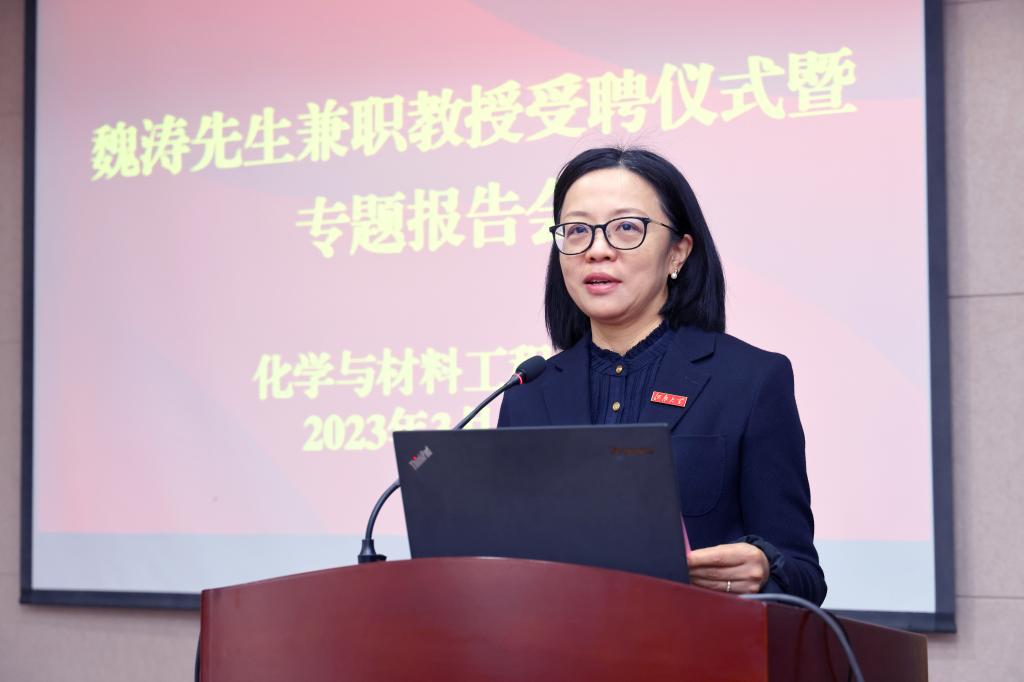 张影陆代表学校为魏涛教授授予了江南大学兼职教授聘书,同时为魏涛教授佩戴了江南大学校徽,并为在座师生介绍了魏涛教授的主要学术成就,表达了对魏涛教授到来的热烈欢迎和衷心感谢。