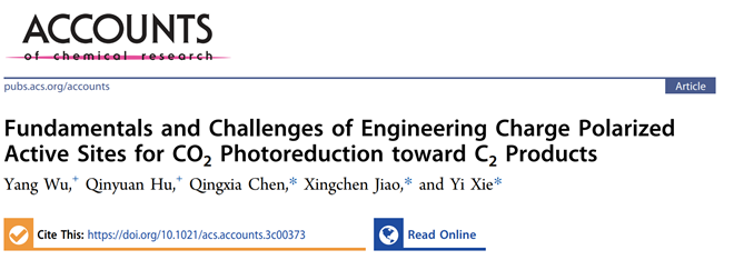近期,焦星辰教授、陈庆霞副教授与中国科学技术大学谢毅院士合作,在光还原CO2催化剂材料设计方面发表重要综述论文,相关工作在化学三大综述期刊之一“Accounts of Chemical Research”上发表:“Fundamentals and Challenges of Engineering Charge Polarized Active Sites for CO2Photoreduction towards C2Products”。Accounts of Chemical Research是美国化学会旗下的国际著名期刊,是国际上最具权威性的综述性期刊之一,旨在介绍化学、生物化学、材料科学、纳米科学等相关研究领域的最新研究进展。该刊物不同于一般的综述性期刊,它具有鲜明的“自我综述”的特色,主要是描述通讯作者自己的系统性研究工作,并且要对该领域的未来发展方向给出视野独特、具有前瞻性的展望。在Accounts of Chemical Research上发表学术论文,是作者所开展的研究工作具有系统性、创新性和重要国际影响力的标志之一。这是我院以第一单位在此期刊发表的首篇论文,论文第一作者为中国科学技术大学博士生吴洋和江南大学硕士生胡秦源。