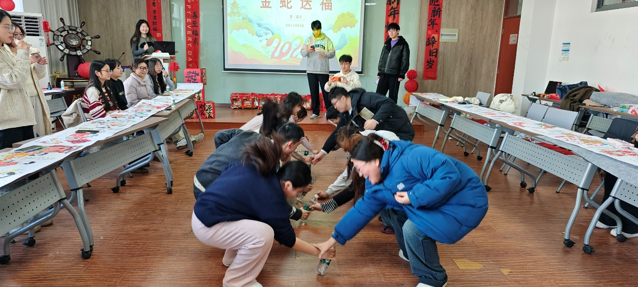 分组游戏环节更是将现场气氛推向高潮。同学们踊跃参与,“光盘拔河”中大家巧妙用力,尽显肢体协调能力;“抢瓶子”游戏里反应敏捷,迅速出手;“拼字游戏”展现出对汉字的深厚认知;“祝福语问答”考验着大家的记忆力;全体学生共同绘制“新春画卷”时,创意无限,尽显艺术才华。现场欢声笑语此起彼伏,处处洋溢着欢乐祥和的氛围。各小组齐心协力,充分彰显了个人风采与团队协作精神。游戏结束后,学院为积分排名前三的小组发放“福星高照”新年礼包,为后三名小组送上“吉祥如意”新年礼包。