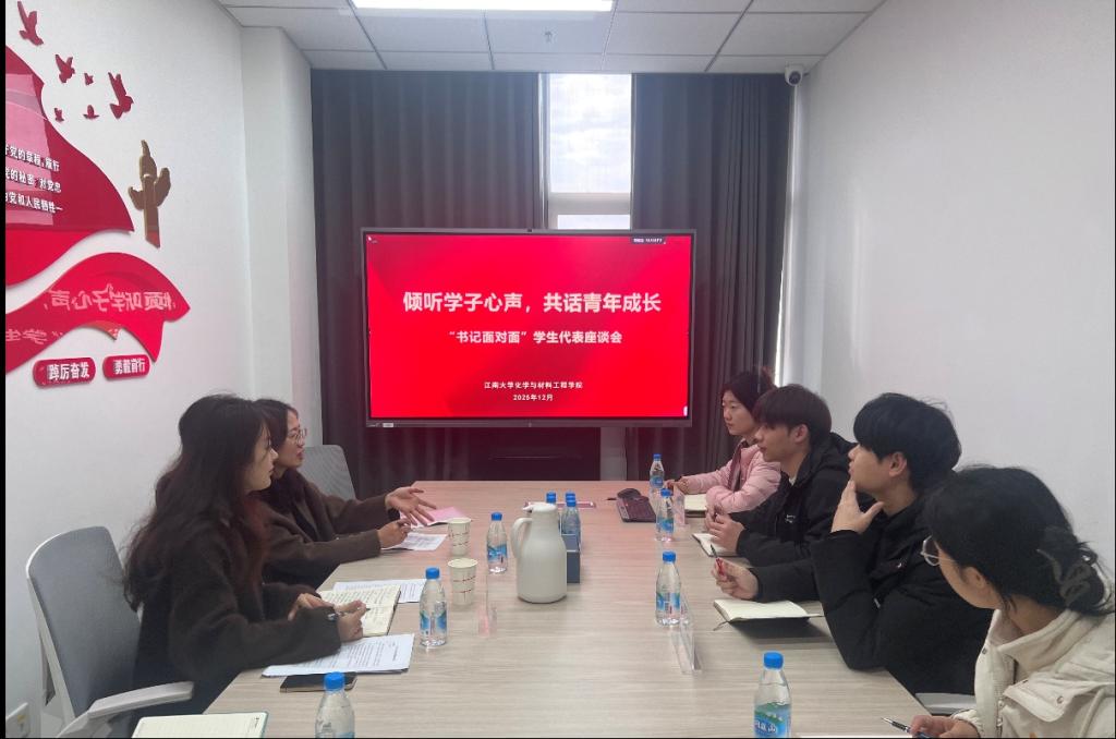 实验室走访结束后,周书记主持召开“书记面对面”学生代表座谈会,研究生辅导员李晓洁老师及宜兴校区四个学生党支部书记参加座谈。会上,周书记听取了各支部书记关于支部建设、组织生活开展、党员教育管理以及学生在宜兴校区学习生活情况的汇报,重点了解了实验室科研氛围、学生作息安排、学业压力疏导以及党建与业务融合等方面的情况。