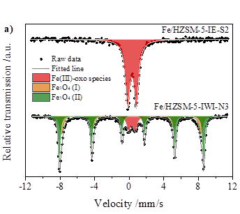 一直以来,CH4无氧芳构化反应主要围绕着钼基分子筛催化剂开展研究,其他过渡金属如铁等作为活性组分普遍被认为具有很低的活性和芳烃选择性。然而,我校化工学院刘小浩团队基于对CH4分子中C-H键可控活化机制的认识和理解,通过调控Fe物种在HZSM-5分子筛中的存在形式,实现了CH4分子的可控活化,高效转化生成芳烃。实验和表征结果表明:Fe-oxo活性物种(含氧铁物种)对实现C-H键的可控活化起关键作用。比较而言,金属铁或碳化铁物种能使CH4分子深度脱氢,生成积碳,减少目标产物芳烃的生成。有趣的是,尽管该项研究使用含硫的二价铁前驱体(FeSO4)经离子交换形成活性中心,然而残存的硫(S)并没有因其提升C-H键活化而影响目标产物芳烃的生成。