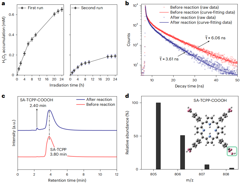图3:常温(293 K)下,SA-TCPP光催化产生H2O2的性能和CO3H反应中间体的累积