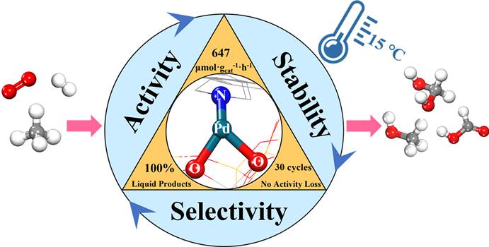 利用分子氧(O2)将甲烷选择性氧化为可运输的高值含氧产品(甲酸、甲醇等)对于清洁能源生产和大宗化工合成至关重要。然而,因为O2解离产生表面活性O*物质是非常困难的,因此直接使用O2作为氧化剂实现甲烷直接转化通常需要极端反应条件,如高温或强氧化气氛以活化氧气。但在上述极端反应条件下,利用形成的表面O*物质将初始增值氧化产物过度氧化为CO2和H2O在热力学上有利,这导致高附加值产物的产率及选择性极低。受O2在酶体系中被生物还原剂还原活化启发,引入H2可以很容易地捕获吸附的分子氧(O2*),在温和的条件下原位合成活性氧物种以活化甲烷。其中,之前的报道普遍认为O2和H2在低温下生成的H2O2或羟基自由基(•OH)是催化甲烷活化的活性氧物种,然而,由O2和H2原位形成的表面羟基的作用一直被忽视。