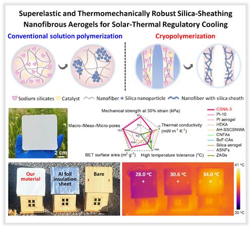 近日,我院刘天西教授团队在有机-无机气凝胶复合材料的设计制备及其光-热协同管理方面取得重要研究进展,研究成果以“Cryopolymerization-Enabled Superelastic and Thermomechanically Robust Silica‑Sheathing Nanofibrous Aerogels for Solar-Thermal Regulatory Cooling”为题在线发表在《Advanced Functional Materials》上(DOI:10.1002/adfm.202425527)。论文第一作者为江南大学硕士研究生孙佳慧,通讯作者为江南大学刘天西教授和东华大学张超研究员。