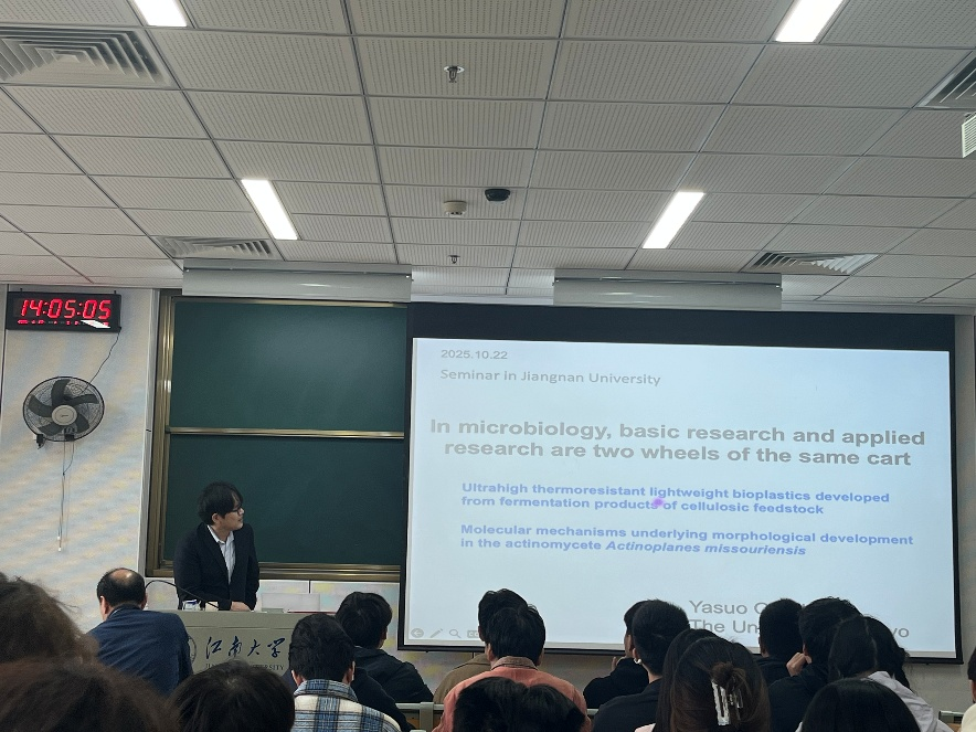 10月22日,东京大学Yasuo Ohnishi教授应邀来我校访问,并在江南大学东氿校区知行楼C102做学术报告。此次报告会由我院金子达雄教授主持。