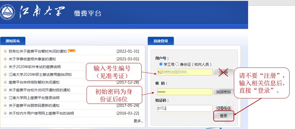 登录用户名为准考证上的考生编号(请考生下载准考证查看,准考证打印系统网址:http://yzgmis.jiangnan.edu.cn/zsgl/bswb/login.aspx),初始密码为身份证号码后6位。如不能正常显示收费项目,建议更换为360浏览器兼容模式。