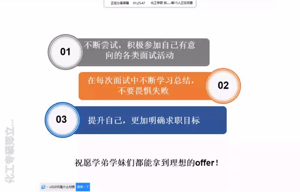 杨鹏举首先分享他的求职经历,他依次介绍了徐工集团、万华化学、宝洁、海力士等公司的笔试面试流程,然后分享了宝贵的经验,最终选择了海力士。他强调简历上的个人经历不一定非得是重大事件,要重点突出这件事因为自己而产生了什么不同。求职前期可以多参加面试,总结反思,既可以积累实战经验,也可以逐渐发现自己真正适合的岗位。同学们听完分享后收获很多,在QQ群里提出了很多问题,有同学提问秋招什么时候开始准备比较好,杨鹏举同学建议5月之前可以找实习,7、8月确定目标公司并练习表达(双语),9、10月实战积累经验,11月收获offer。