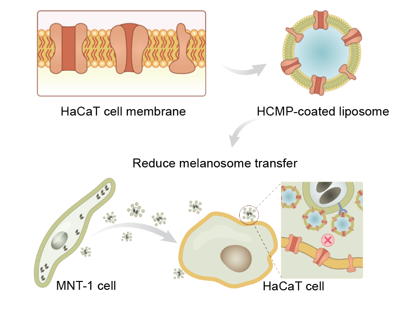 针对这一难题,杨成教授团队创新性地提出:基于皮肤基底层中角质形成细胞与黑色素细胞固有的细胞通讯机制,通过仿生细胞膜干预黑素小体在角质形成细胞与黑色素细胞间的转运过程,实现更安全有效的美白策略。团队利用微流控技术,精准设计脂质和膜蛋白的自组装结构,构建出了粒径均一、膜蛋白嵌入率高且生物活性保留良好的角质形成细胞膜蛋白仿生脂质体(HCMP-coated liposome),实验结果表明,该脂质体可精准锚定于黑色素小体表面,显著降低其被角质形成细胞识别与摄取,黑素小体转运效率下降达70%