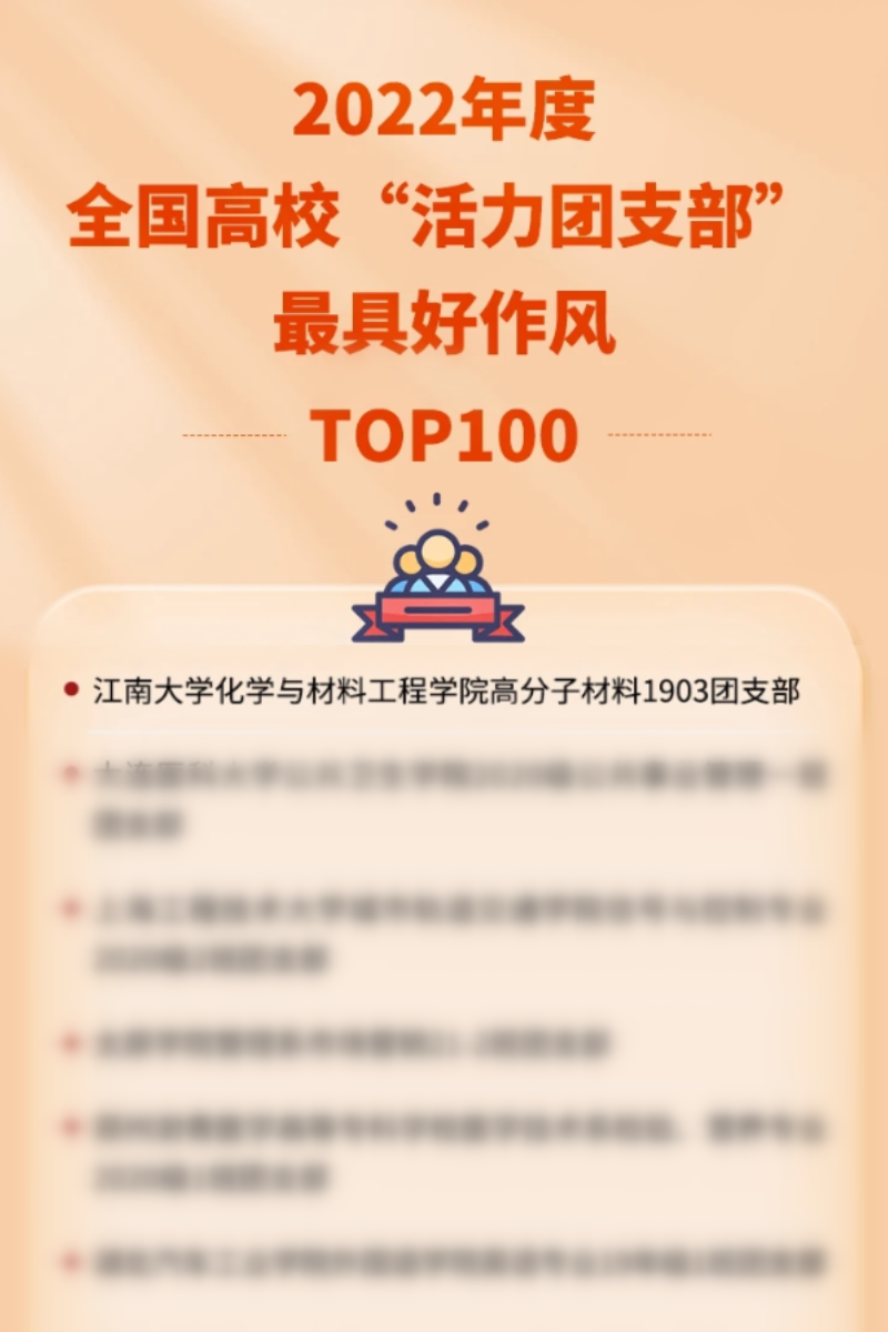 为深入贯彻“全团抓思想政治引领”“全团大抓基层”“全团抓学校”工作部署,落实《关于改革创新高校共青团工作 切实增强思想政治引领实效的若干措施》,激发高校团支部活力,团中央基层建设部指导中国青年报社开展了2022年度高校“活力团支部”风采展示活动,betway中国西汉姆联官网高分子材料1903团支部经过校内选树、校级展示、省级展示、全国展示等环节,成功入选2022年度全国高校“活力团支部”风采展示活动,经过后期评比,荣登《2022年度全国高校“活力团支部”最具好作风TOP100榜》。