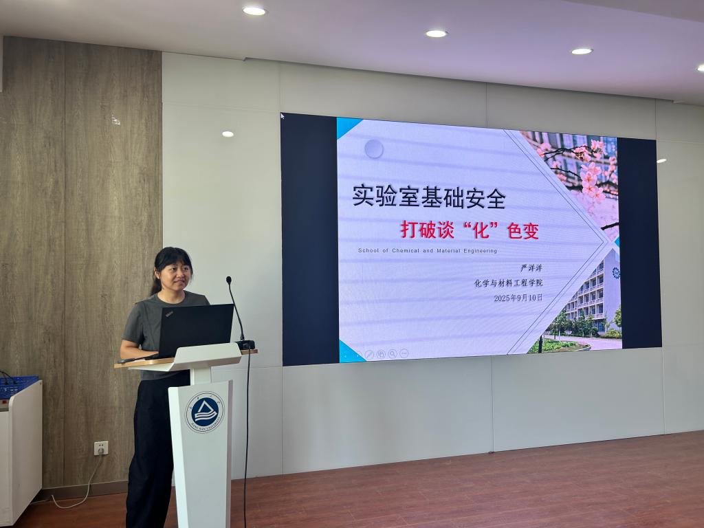 随后由严洋洋老师围绕“实验室安全”开展专题讲座。她先从典型实验室安全事故案例切入,通过真实事件剖析强调安全操作的重要性,结合化学学科特点,详细讲解了常见实验室安全隐患类型、学院安全基础设施的配置与使用方法,以及各类防护设备的正确操作要领。她重点提醒同学们,在遇到紧急情况时要保持冷静、沉着应对,按照规范流程处理问题,始终将人身安全放在首位。