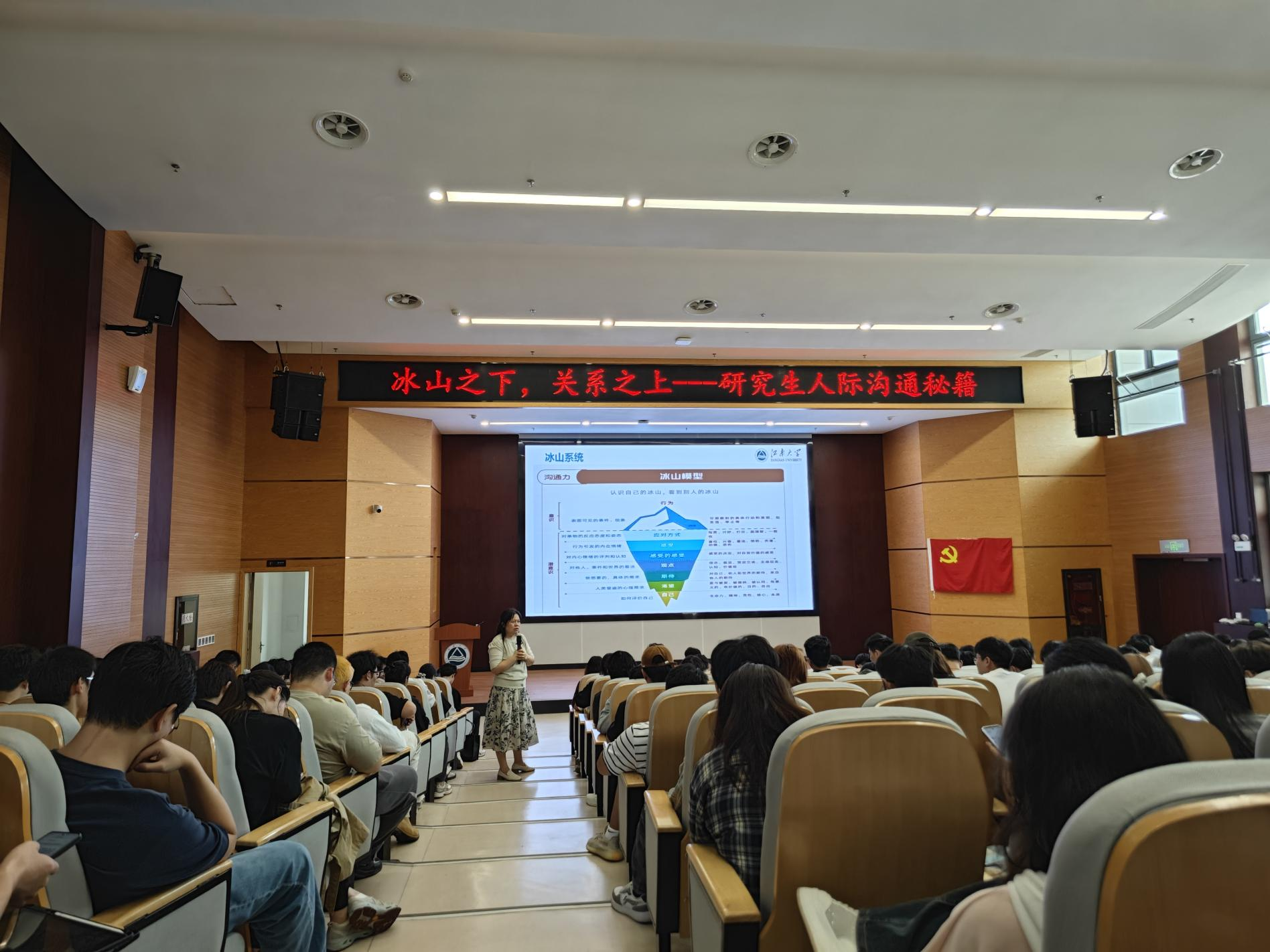 讲座伊始,陈华平老师先以轻松有趣的手指操调动观众情绪,活跃现场氛围。紧接着,她围绕人际沟通展开讲解,提出“自己、他人、情景”三大要素,并借助“冰山模型”深入解读行为表现的深层逻辑——该理论指出,可以通过分析表面可见的事件与现象,来探寻个体对他人、事件及世界的深层次认知。随后,陈老师介绍了人们面对事件的五种典型应对姿态,并鼓励大家按照“尊重自己、尊重他人、尊重现实”的原则,以乐观、稳定、自信的心态应对压力与困难。