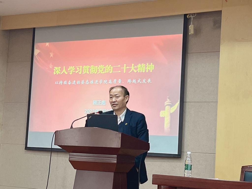 3月8日下午,化工学院B329会议室举行新学期教职工政治理论学习第一课,校党委常委、副校长顾正彪教授以《深入学习贯彻党的二十大精神,以持续奋进的姿态推进学院高质量、跨越式发展》为题为全体教职工主讲党的二十大精神专题内容。