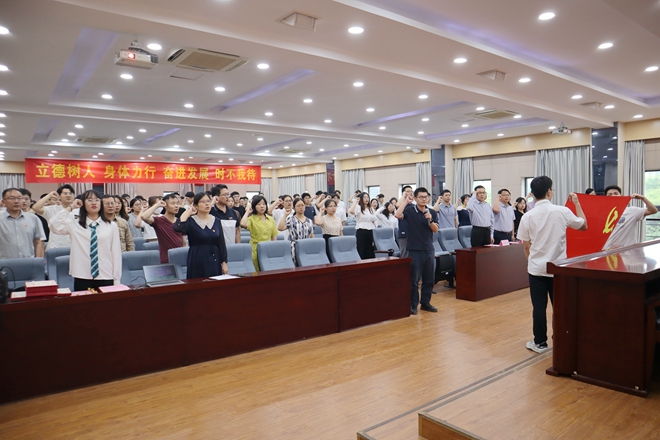 大会在庄严的《国际歌》中启幕。院党委副书记、副院长董霞宣读新发展预备党员名单。随后,分团委书记刘凡领誓,全体党员面对鲜红的党旗,庄严宣誓,表达了身为共产党员的责任与担当,八十字的誓词,字字铿锵,句句千钧,进一步坚定了共产党员的理想信念。宣誓结束,学院领导、教师党员代表共同为预备党员佩戴党员徽章。新党员代表张诗茹同志以“把小我融入大我、矢志求学报国”为主题,回顾党史,展望未来,以习近平总书记的教诲与在座的党员同志共勉,号召全体党员同志在火热的青春中放飞人生梦想,在拼搏的青春中成就事业华章。