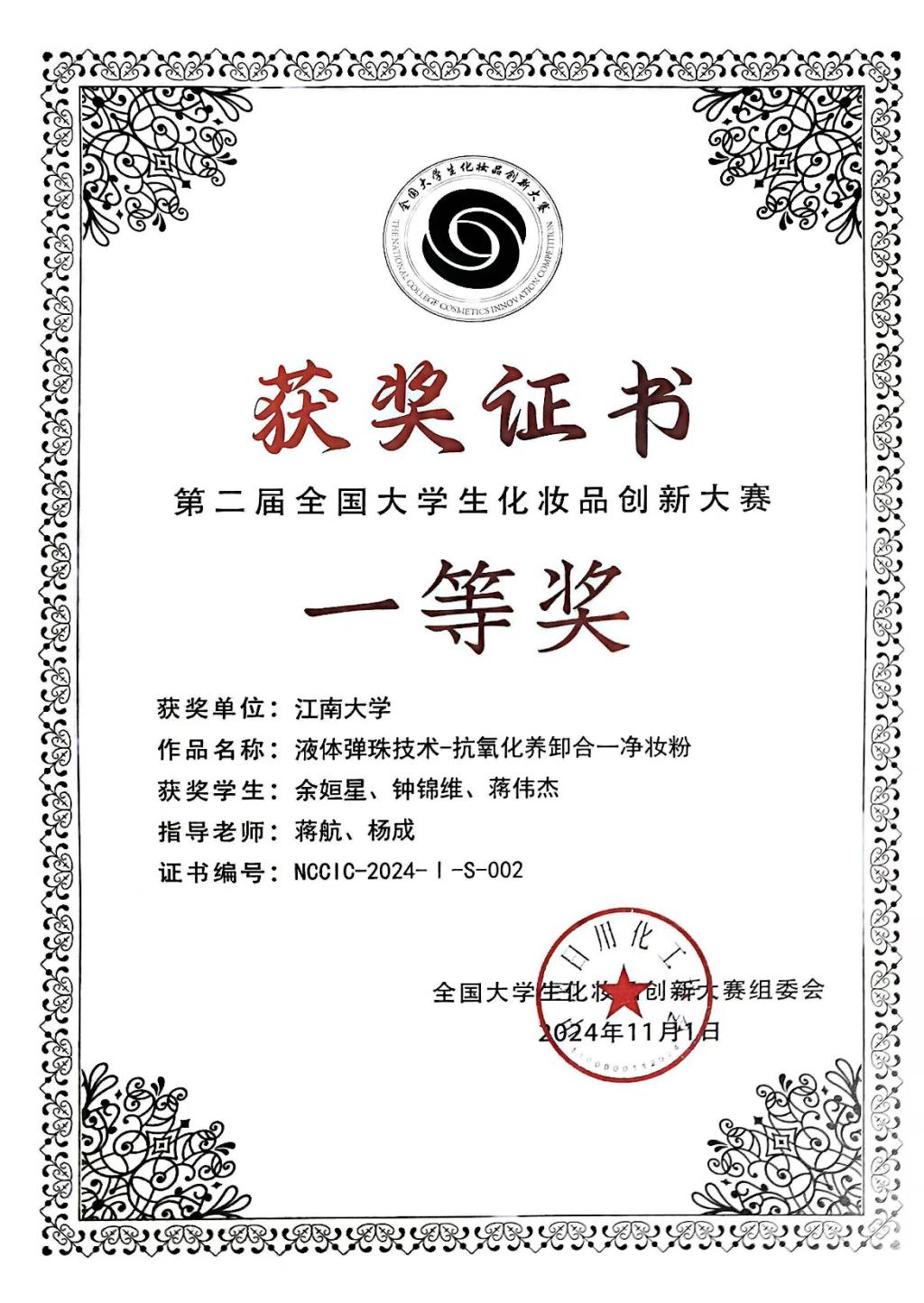 江南大学团队的参赛项目为“液体弹珠技术-抗氧化养卸合一净妆粉”,由蒋航、杨成老师指导,团队成员余姮星、钟锦维、蒋伟杰通过反复实验和市场调研,成功研发出创新产品,并在决赛答辩中赢得了评委们的一致好评。