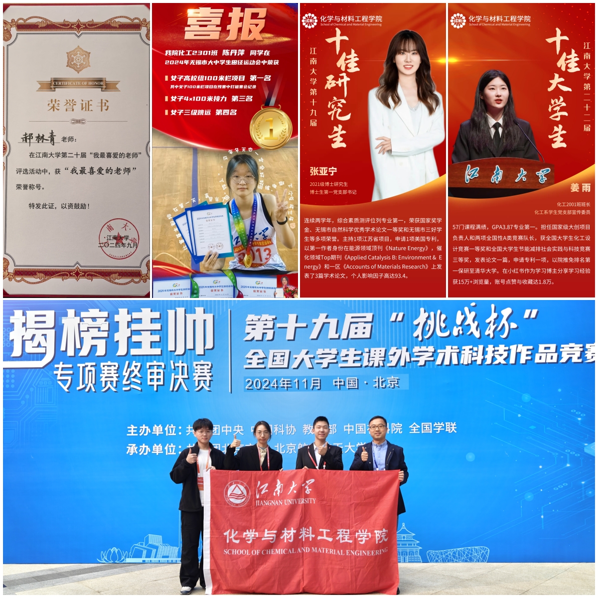 郝林青获评江南大学第二十届“我最喜爱的老师”;张颖指导学生团队获第十九届“挑战杯”全国大学生课外学术科技作品竞赛2024年度“揭榜挂帅”专项赛一等奖;博士生张亚宁、本科生姜雨分获江南大学“十佳研究生”“十佳本科生”;化工2301班陈丹萍获2024年无锡市大中学生田径运动会女子高校组100米栏项目第一名。