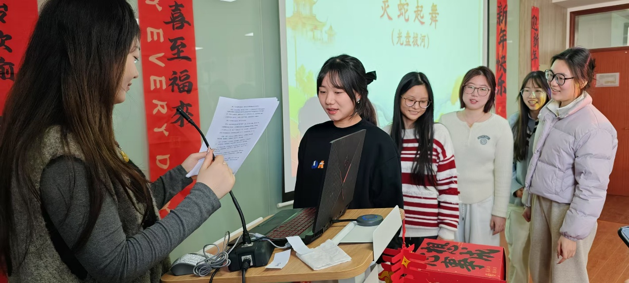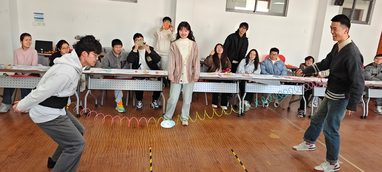 分组游戏环节更是将现场气氛推向高潮。同学们踊跃参与,“光盘拔河”中大家巧妙用力,尽显肢体协调能力;“抢瓶子”游戏里反应敏捷,迅速出手;“拼字游戏”展现出对汉字的深厚认知;“祝福语问答”考验着大家的记忆力;全体学生共同绘制“新春画卷”时,创意无限,尽显艺术才华。现场欢声笑语此起彼伏,处处洋溢着欢乐祥和的氛围。各小组齐心协力,充分彰显了个人风采与团队协作精神。游戏结束后,学院为积分排名前三的小组发放“福星高照”新年礼包,为后三名小组送上“吉祥如意”新年礼包。