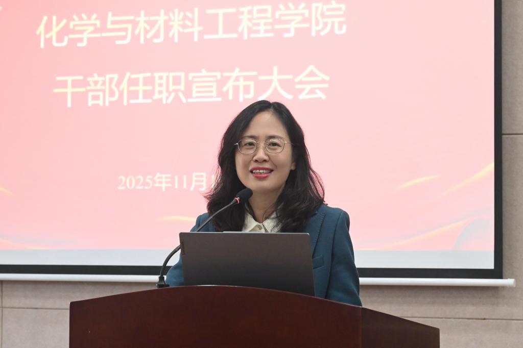 周雪晖作表态发言。她表示,重回化工学院担任党委书记,既倍感温暖又深感使命光荣、责任重大。感谢学校党委的信任,感谢原班子和全体教职工打下的坚实基础。她围绕“传承与创新”“学习与实践”“责任与担当”三个方面分享心声,表示将传承学院优良传统,主动适应新形势新要求,加强理论学习和学科专业认知,与院长密切合作,团结带领班子成员坚持民主集中制,落实立德树人根本任务,深化教育教学改革,加强科研集成创新,提升治理效能,不负重托推动学院各项工作再上台阶。