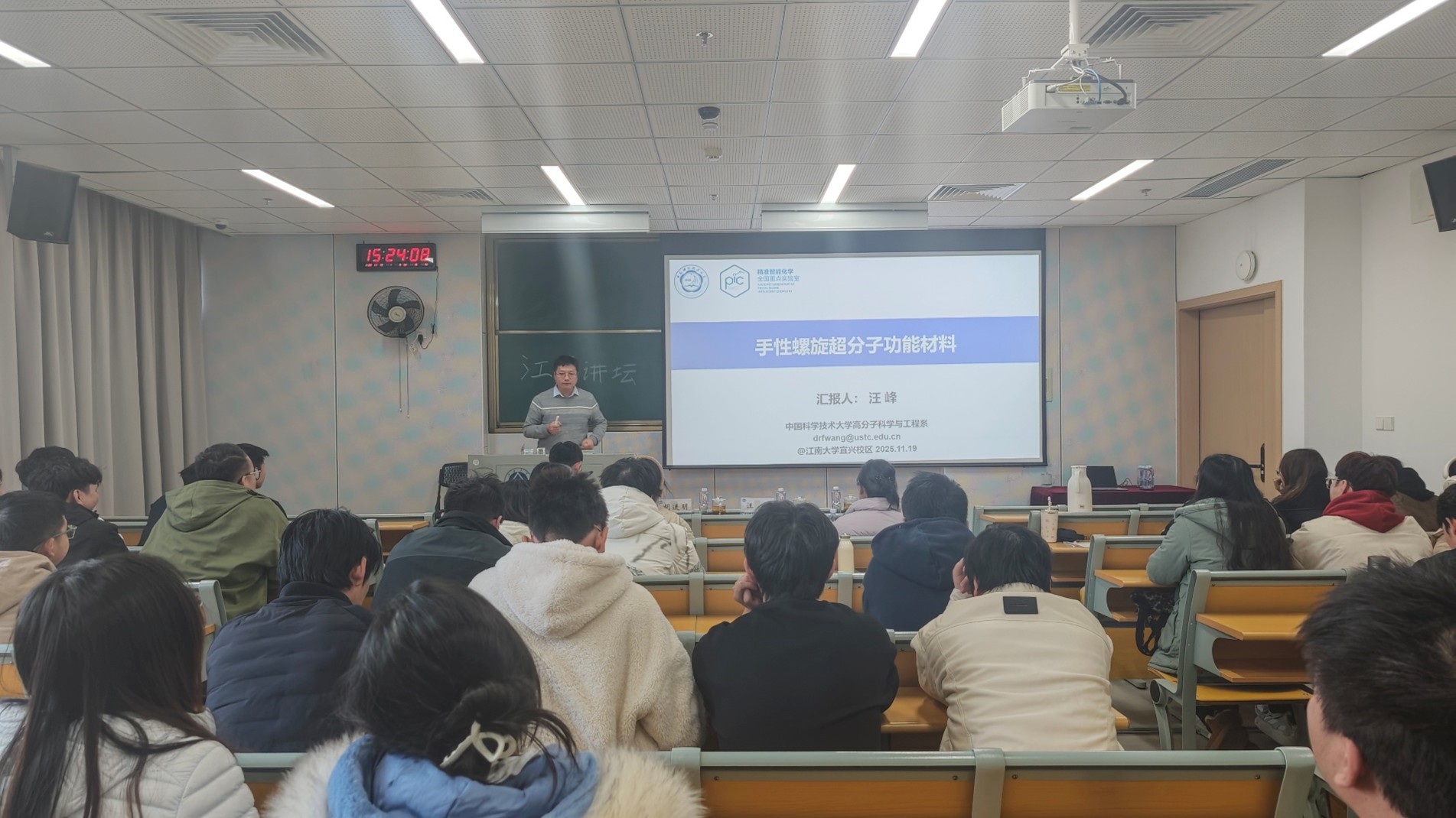 11月19日下午,由江南大学研究生院主办,betway中国西汉姆联官网承办的江南讲坛第一百五十八讲和第一百六十讲学术报告在江南大学东氿校区知行楼C202教室举行。讲座由化工学院副院长马丕明主持,中国科学技术大学化学与材料科学学院胡进明、汪峰教授主讲,内容涵盖气体药物靶向递送、手性螺旋超分子功能材料等多个前沿领域,现场学术氛围浓厚,与会研究生热情高涨。