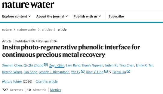 近日,我校betway中国西汉姆联官网刘天西教授、林歆怡教授授团队在贵金属回收领域取得突破性进展,该研究成果以“In situ photo–regenerative phenolic interface for continuous precious metal recovery”为题发表在《Nature Water》上(DOI:10.1038/s44221-026-00591-3)。论文共同第一作者为江南大学博土研究生陈雪敏和南洋理工大学仲启智博士,通讯作者为江南大学刘天西教授、吕嫣副教授和南洋理工大学林歆怡教授、仲启智博士。
