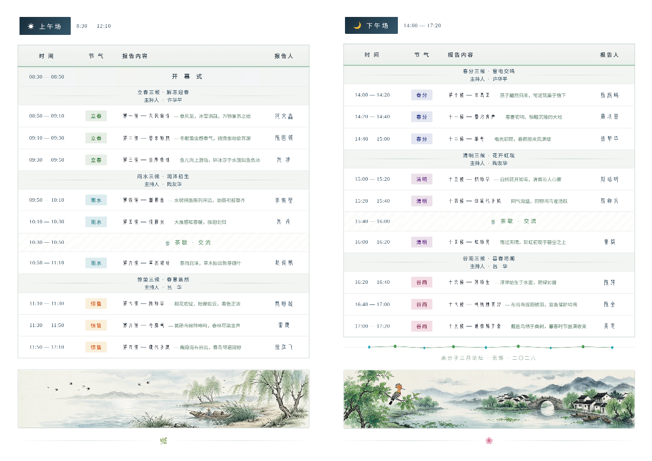 会议日程以“立春”“雨水”“惊蛰”“春分”“清明”“谷雨”六个春日节气的十八候意象为线索,将自然时序之美融入学术交流之中。这样的安排,既寄望报告如“东风解冻”“草木萌动”,在高分子科学中讲出新问题、新方向与新气象;也期待如“雷乃发声”,在坦诚而深入的讨论中激发争鸣,使学术认识在辨析中不断趋于深刻与真切。十八场报告彼此辉映,既有理性凝练的学术表达,也因江南春光的映照而更添一层温润悠长的文化韵味,使与会师生在聆听与交流之中,真切感受到高分子学科不同思想相互激发、彼此照亮的学术之美。