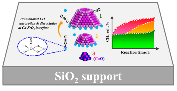 图2. 钴纳米粒子尺寸大小对甲烷选择性演变的影响及Co-ZrO2界面效应