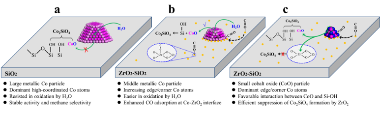 图3. 金属钴纳米粒子表面钴活性位点的落位对催化剂结构演变和反应过程的影响