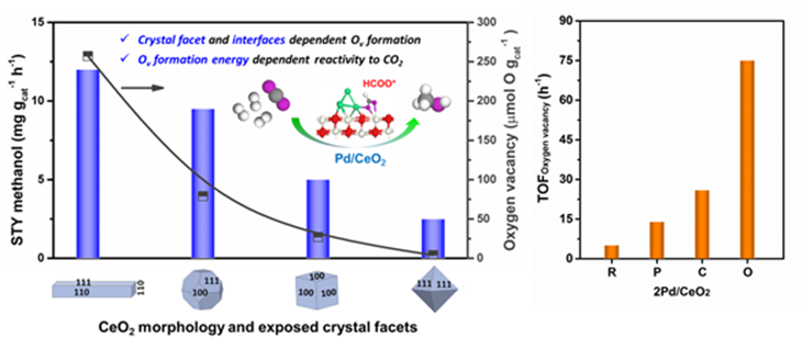 温室气体CO2的高效活化与转化制高价值的燃料和化学品对解决人类社会的可持续发展具有重要意义。在本项工作中,为了揭示影响CO2活化转化的关键科学问题,该课题组合成了具有特定形貌和晶面结构的CeO2载体并制备了Pd/CeO2催化剂用于CO2加氢制甲醇的反应性能研究。结果表明:CO2的反应速率强烈依赖氧空位形成能;较低的氧空位形成能有利于形成更多的氧空位,然而,较高的氧空位形成能有利于单个氧空位活性(TOF O vacancy)的提高。棒状CeO2较低的氧空位形成能导致高的平均氧空位密度(μ mol O mcat-2),尽管形成了更多的氧空位数量有利于增加CO2分子的吸附位点,以及可能因更近的氧空位间距导致“双位协同”效应而提升CO2的吸附活化,然而,计算的单个氧空位反应活性很低。对于八面体CeO2而言,高的氧空位形成能导致低的平均氧空位密度,实验结果证实其单个氧空位反应活性是棒状CeO2的15倍。因此,合适的氧空位形成能对提高单个氧空位上CO2分子的吸附、转化频率十分重要。