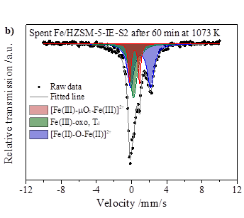 一直以来,CH4无氧芳构化反应主要围绕着钼基分子筛催化剂开展研究,其他过渡金属如铁等作为活性组分普遍被认为具有很低的活性和芳烃选择性。然而,我校化工学院刘小浩团队基于对CH4分子中C-H键可控活化机制的认识和理解,通过调控Fe物种在HZSM-5分子筛中的存在形式,实现了CH4分子的可控活化,高效转化生成芳烃。实验和表征结果表明:Fe-oxo活性物种(含氧铁物种)对实现C-H键的可控活化起关键作用。比较而言,金属铁或碳化铁物种能使CH4分子深度脱氢,生成积碳,减少目标产物芳烃的生成。有趣的是,尽管该项研究使用含硫的二价铁前驱体(FeSO4)经离子交换形成活性中心,然而残存的硫(S)并没有因其提升C-H键活化而影响目标产物芳烃的生成。