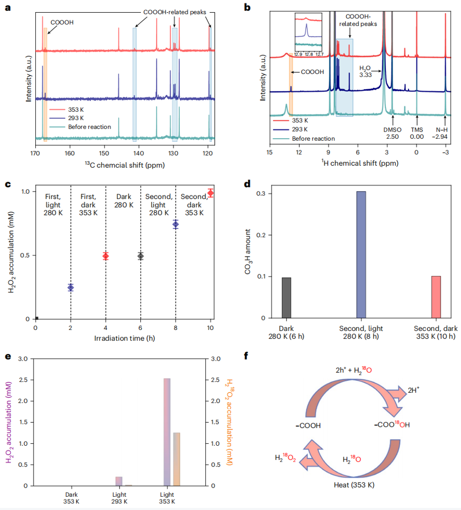 图3:常温(293 K)下,SA-TCPP光催化产生H2O2的性能和CO3H反应中间体的累积