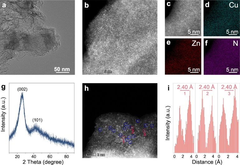 对比单原子催化剂,双单原子催化剂(DAS)具有更为丰富的原子配位环境及元素组合选择性,被广泛应用于电催化CO2还原反应(CO2RR)研究。现阶段,大量研究将DAS催化剂的活性来源简单归因于DAS间的协同作用,限制了DAS催化剂的进一步发展。因此,DAS间电荷作用的可视化及其在电催化还原CO2过程中的反应动力学行为对于CO2RR的深入机理研究至关重要。针对这一问题,课题组提出了原子间的电荷转移策略,利用氮化碳(C3N4)衍生N掺杂碳(NC)衬底制备了具有独特配位结构(CuN4-ZnN4)的铜锌双原子位点(CuZn-DAS)电催化剂对上的金属前体之间的空间距离进行排序,如图2所示。CuZn-DAS/NC表现出优异的CO2RR活性及CO产物选择性。CuZn-DAS/NC的CO的法拉第效率(98.4%)高于对比催化剂Cu-SAS/NC(36.4%)和Zn-SAS/NC(66.8%)。原位表征表明,相较于单原子位点催化剂,CuZn-DAS更有利于*COOH的形成和吸附。理论计算表明,CuZn-DAS/NC中相邻Cu原子的引入能够有效调控Zn活性位点,通过提高双原子位点的d带中心,增强与*COOH中间体的结合强度,降低整体反应能垒,进而表现出十分优异的CO2RR活性及CO产物选择性。