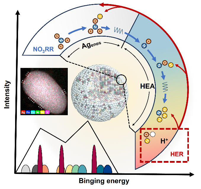 基于两种路径不同的反应特性,课题组从理论指导研究出发分别设计了高熵合金和核壳结构两种催化剂来分别提升二者的产物选择性和产率。针对硝酸根还原反应(NO3RR),高熵合金(HEA)催化剂由于其多位点特征和构型复杂性有望打破线性标度关系(linear scaling relationship, LSR),但多个主成分之间性质的加权平均实际上使其难以偏离LSR所施加的对称依赖性。本项研究中,课题组开发了一种“表面熵减”方法来诱导与合金基底相容性较差的成分的溶出,从而在HEA表面形成受金属原子层(FL-M)。这些出溶的FL-M超越了传统HEA原子构型空间的限制,并与HEA底物在空间上串联协同,在复杂反应中共同充当多个中间体的活性位点。这种FL-M覆盖的HEA在硝酸盐电催化还原为氨(NH3)方面表现出色,法拉第效率为92.7%,NH3产率为2.45 mmol h–1mgcat–1、长期稳定性高(>200 h)。该工作实现了对原子排列的精确操控,从而扩展了已知HEA催化剂的可调控范围及其潜在的应用场景(图1)。